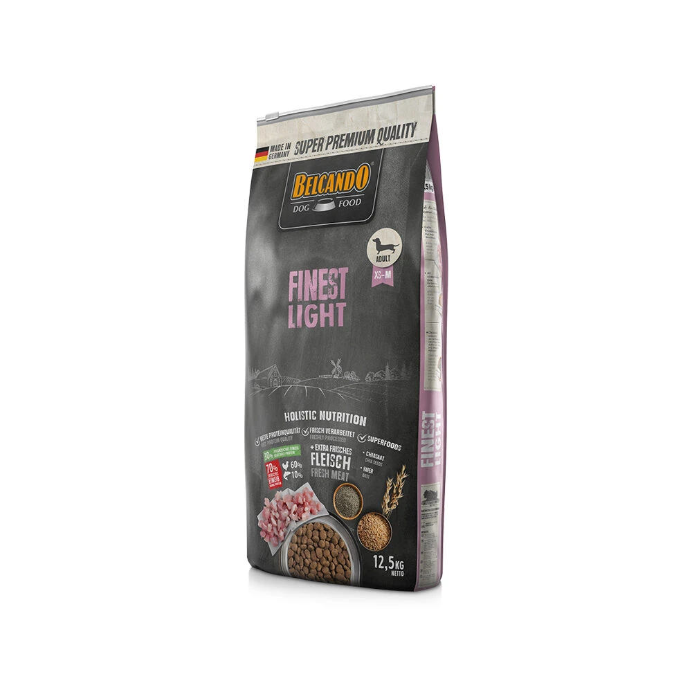 Belcando Finest Light is een speciale voeding voor oudere honden en viervoeters die minder actief zijn. De smakelijke eend en lever bevorderen de eetlust van uw hond. De haver en het hoge vezelaandeel stimuleren het gevoel van verzadiging en zorgen voor het behoud of vermindering van het lichaamsgewicht. Het beperkte gehalte aan eiwit en vet zorgt ervoor dat het voer geschikt is voor oudere honden of viervoeters met geringe activiteit. Door het beperkte gehalte aan fosfor en natrium worden de nieren minder belast.