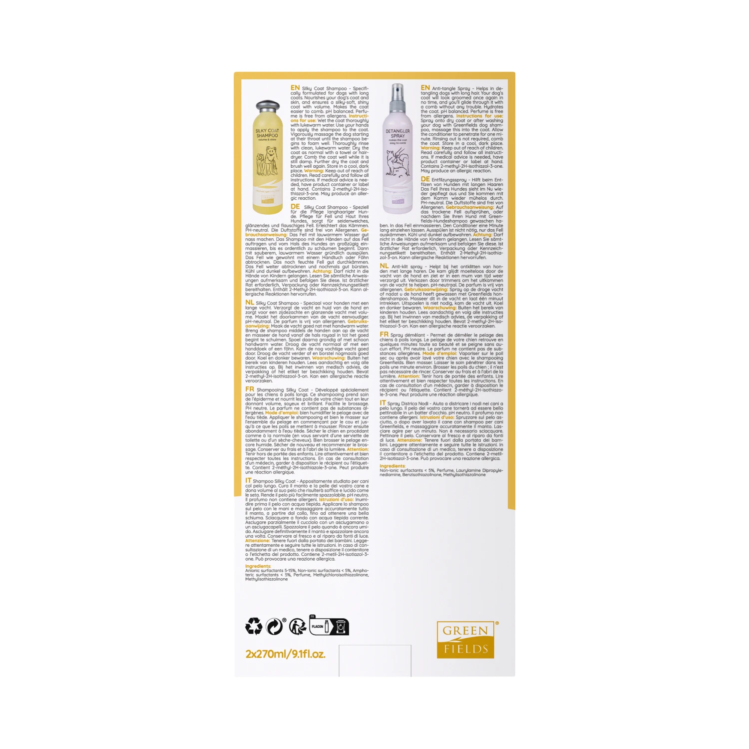 Speciaal voor uw hond met een langharige vacht is er de Yorkshire Terrier Care Set van Greenfields. De verzorgingsset bestaat uit een shampoo en een handige anti-klit spray. De Greenfields Silky Coat Shampoo bevat waardevolle zijde proteïnen. Deze helpen de vacht te versterken aan de binnenkant en de natuurlijke glans terug te brengen aan de buitenkant. De Greenfields Detangler Spray is een anti-klit spray, speciaal voor langharige honden en/of honden met een krullende vacht. Kamille extracten in de spray bevorderen een zachte, glanzende en goed doorkambare vacht.