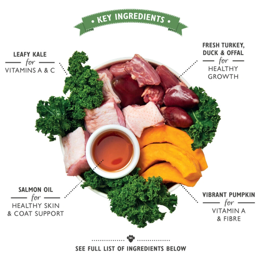 Vers bereide kalkoen (41%); Eend (20%). Zoete Aardappelen (4%) Pompoen; Boerenkool (2%); Veenbessen; Aardappelen; Wortels; Vitaminen en gechelateerde mineralen; Zalmolie (0,5%). Kruiden en planten: guldenroede, brandnetel, anijs, rozenbottel, goudsbloembloemblaadjes, hakmessen, kelp, luzerne, mariadistel, paardenbloemwortel, kliswortel, selderijzaad.