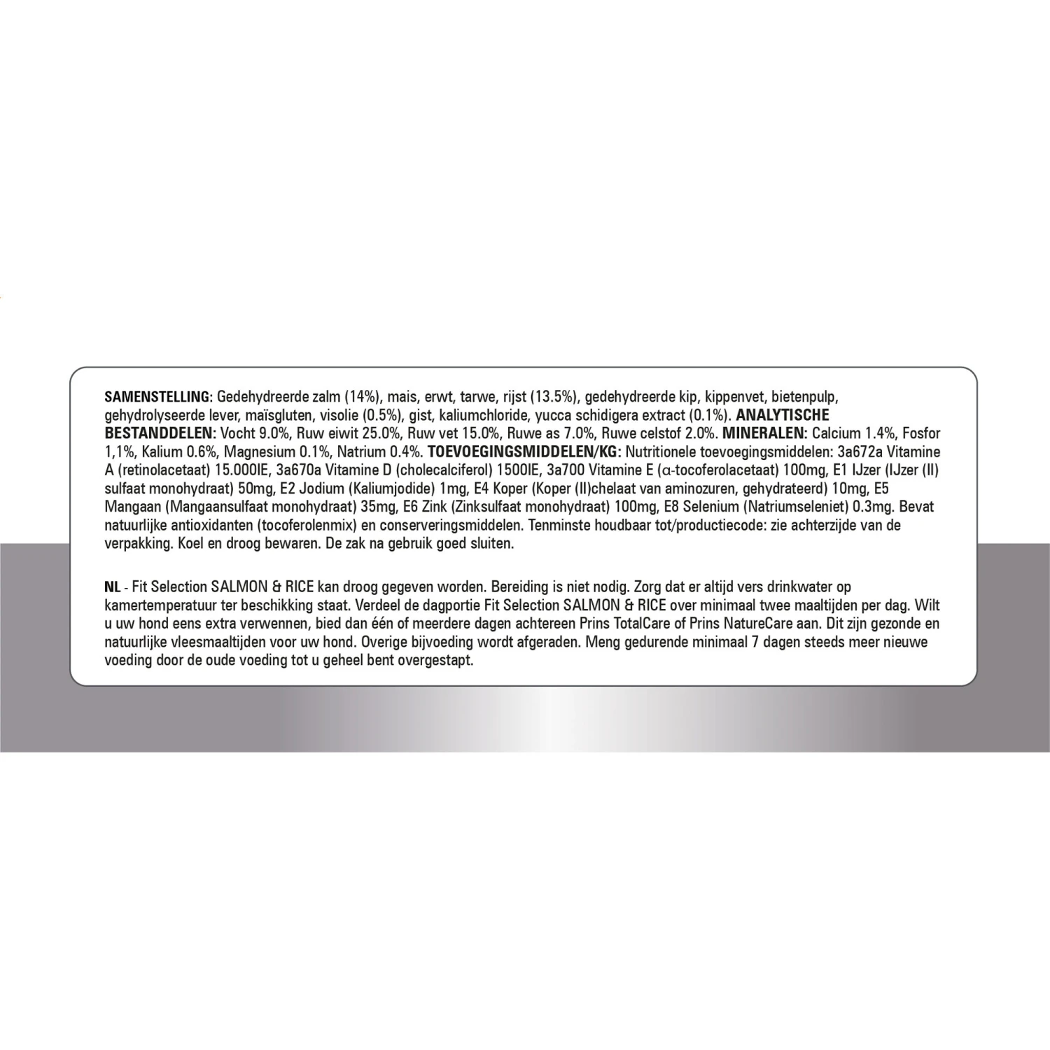 U schotelt uw volwassen (middel)grote hond uitgebalanceerde voeding voor met Fit Selection Salmon & Rice van Prins! Deze smakelijke en complete hondenbrok stimuleert uw viervoeter om te kauwen. Verder draagt het voer bij aan een goede vertering en een evenwichtige darmflora. De voeding, op basis van zalm en rijst, helpt uw hond om fit en gezond te blijven!