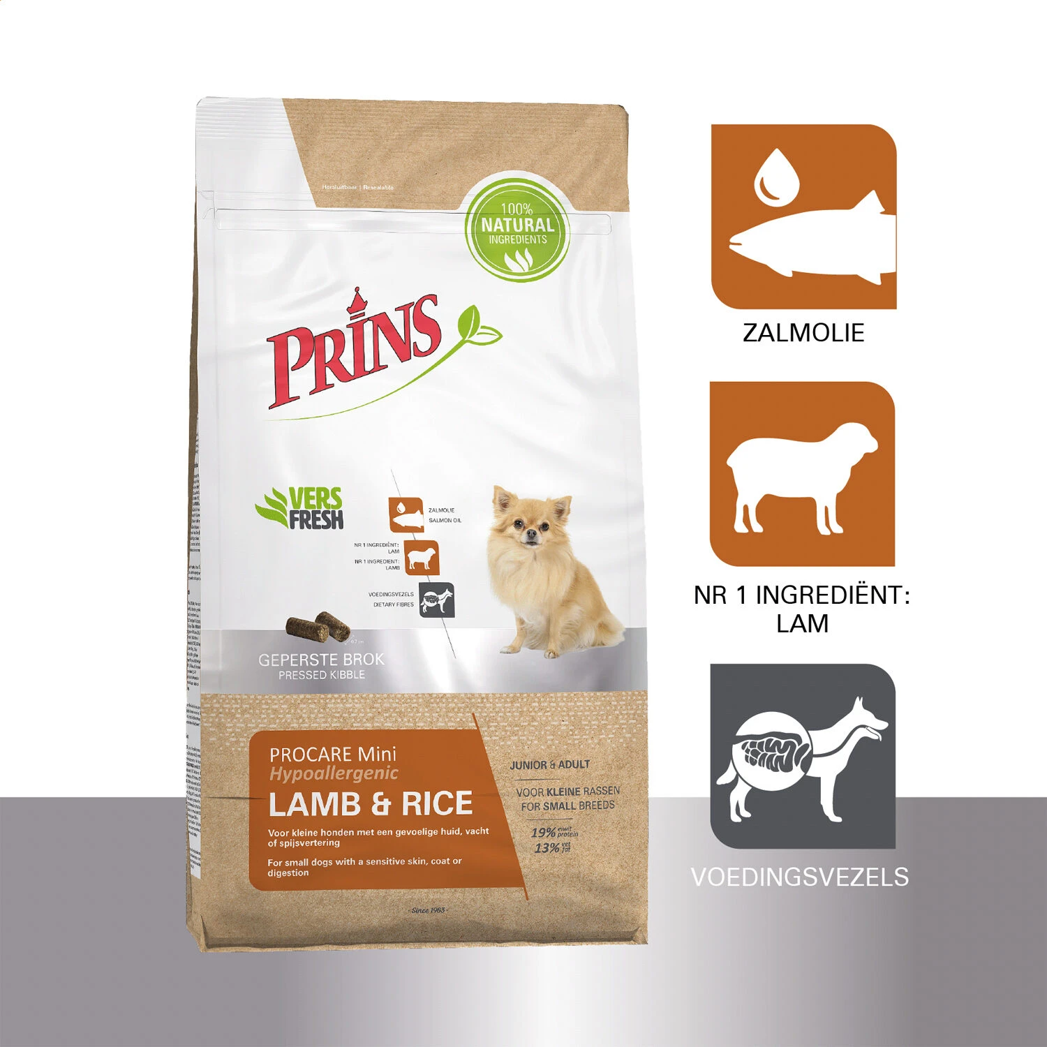 Honden die gevoelig op eten reageren, hebben een aangepaste voeding nodig. De ProCare mini Lamb & Rice Hypoallergenic van Prins is een hypoallergene voeding en vrij van tarwegluten. Deze voeding is speciaal samengesteld voor honden van een klein ras tot 8 jaar oud. Het voer bevat lamsmeel als enige eiwitbron, die bijdraagt op het verminderen van de kans op een overgevoeligheidsreactie. De zalmolie in het droogvoer ondersteunt een gezonde en glanzende vacht. Daarnaast is een goede darmflora erg belangrijk, de voedingsvezels, waaronder FOS, dragen bij aan een goede vertering en evenwichtige darmflora. Als laatst kan nog gezegd worden dat de voeding rijk is aan vitaminen en mineralen, waaronder vitamine D, zink en selenium die het immuunsysteem ondersteunen.