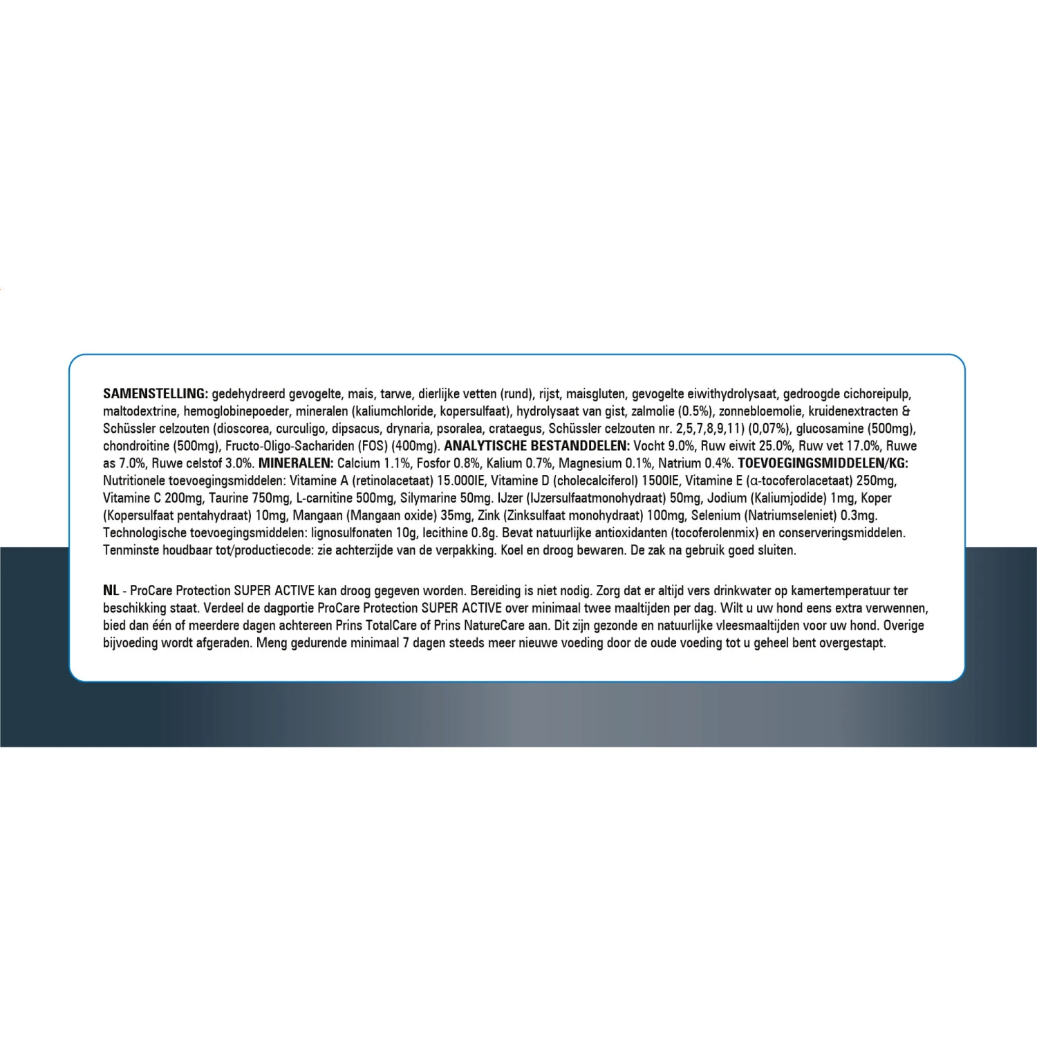 Een super actieve hond thuis? De ProCare Protection Super Active voeding van Prins is er speciaal voor opgroeiende en actieve honden. Ook geschikt voor drachtige en zogende honden. De geperste voeding is volledig en verrijkt met zalmolie, FOS, kruidenextracten en Schüssler celzouten om uw hond in goede conditie te houden. De zalmolie zal bijdragen aan een glanzende en gezonde vacht. Om aan de behoefte van jonge honden te kunnen voldoen bevat de hondenvoeding een hoog vetgehalte. L-carnitine bevordert daarnaast een optimale vetverbranding. Voor soepele spieren en gewrichten van jonge/actieve zal glucosamine en chondroïtine voor ondersteuning zorgen. Met Prins ProCare Protection Super Active helpt u uw hond actief en speels te houden!